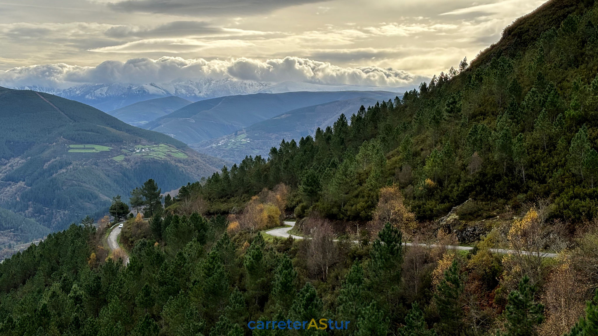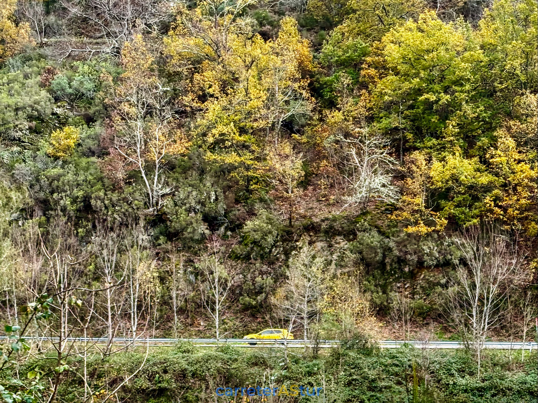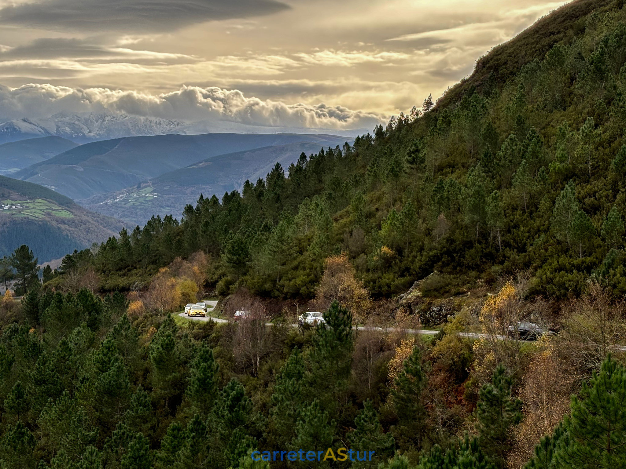 Llega el mensaje que indica el siguiente punto y recorremos el primer tramo que nos lleva a San Antolín de Ibias. Paramos en el Puerto del Connio, para hacer d otos, disfrutar de las vistas... ¡Cruzar Muniellos en otoño es un placer para los sentidos!