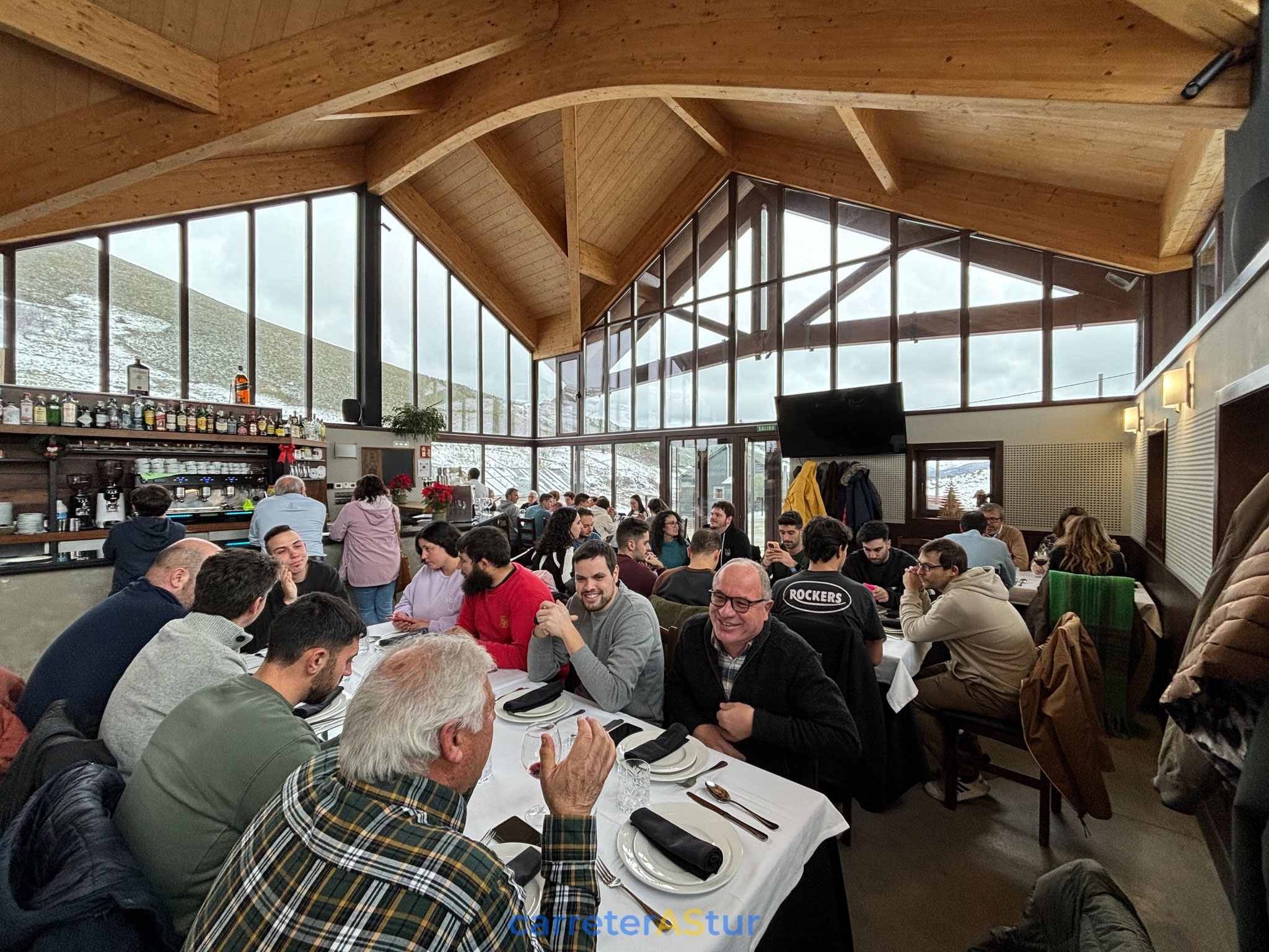 Llega la hora de comer. Lo haríamos ahí cerca, en el Restaurante Leitariegos. El trato recibido, el servicio... todo ha sido de nivel, en un lugar que no necesita adornar sus paredes porque lo tienes todo a las vista a través de los grandes ventanales. Junto a esto, la comida con plato premiado como el pote, algo original como la caldereta del pastor, entrantes y postres... ¡DE DIEZ!